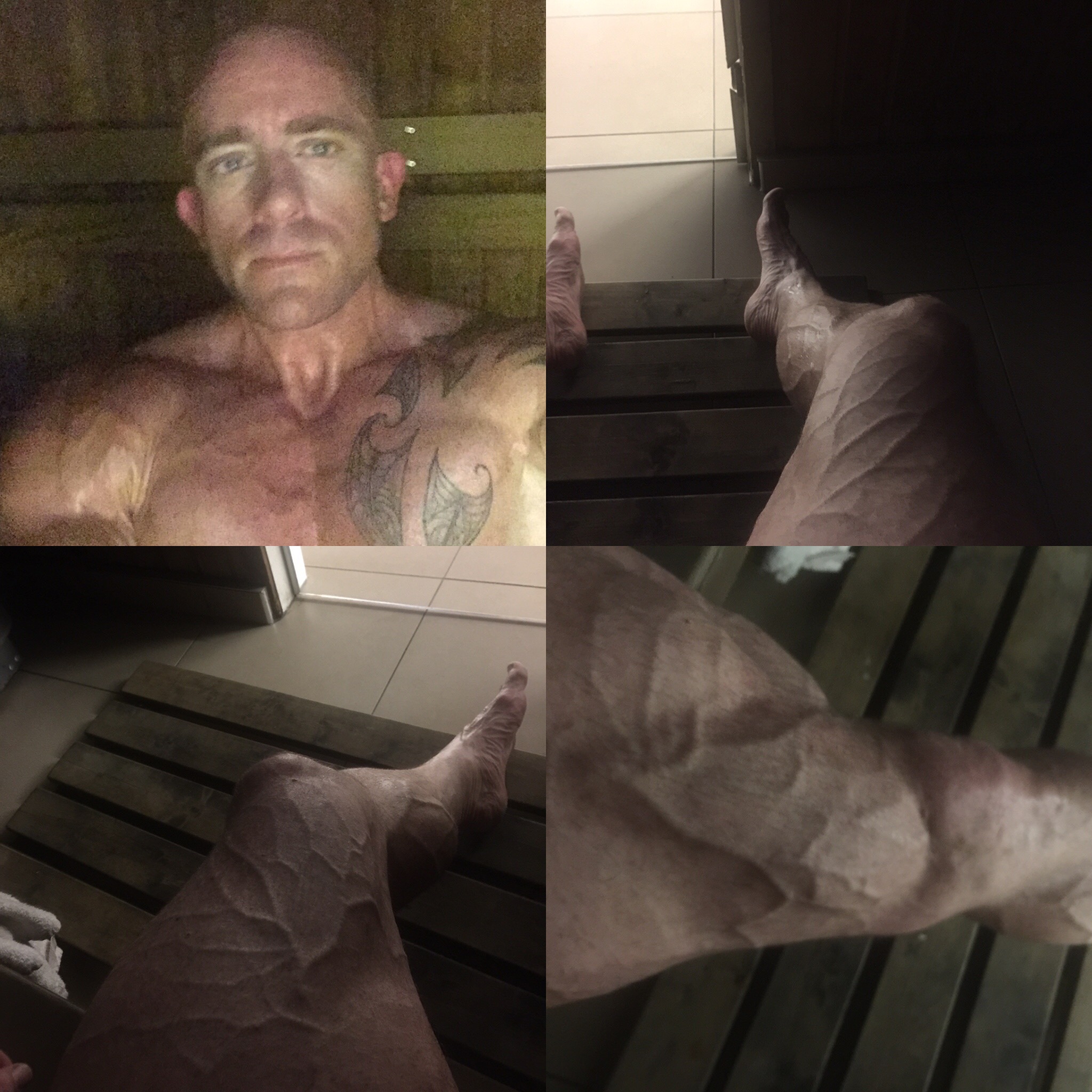 Currently post cheat day- clean carbs two days ago and decided to see how fat I looked holding water from the cheat meal and well still being fluffy . Looking to be 105 by the end of this week. Was 106.5 by the end of the previous seven days...........Photo courtesy of my 7 year old so not flexing quads as this was the best of a bad bunch .