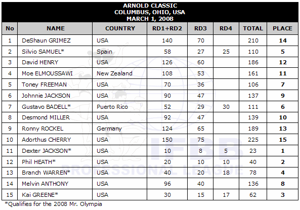 Dexter Jackson wins from Phil Heath! Moe didn't make stop 6, but probably wouldn't be far behind. Greene 3rd, Warren 4th, Samuel 5th and Badell 6th.