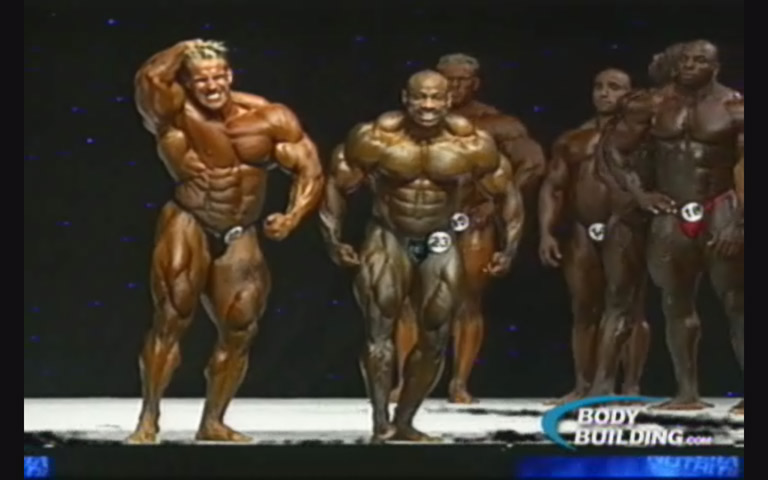 He's probably just earlier in the pose than the others. You often see guys rear lat spread initially with their chest high & shoulders wide then they 'round' their shoulders to bring more lats / traps out.