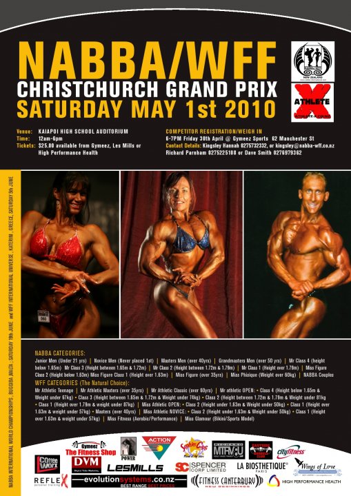 Show Posters should be out around the country in a few days & we will publish all the Sponsors very soon on here & our Facebook pages. There has been a tremondous response & we are very pleased that so many have seen to support us as a new federation. Kingsley is working on a NABBA/WFF NZ website which will be launched shortly & will give all the details about membership, catagories, entry fees & competition rules in one place.