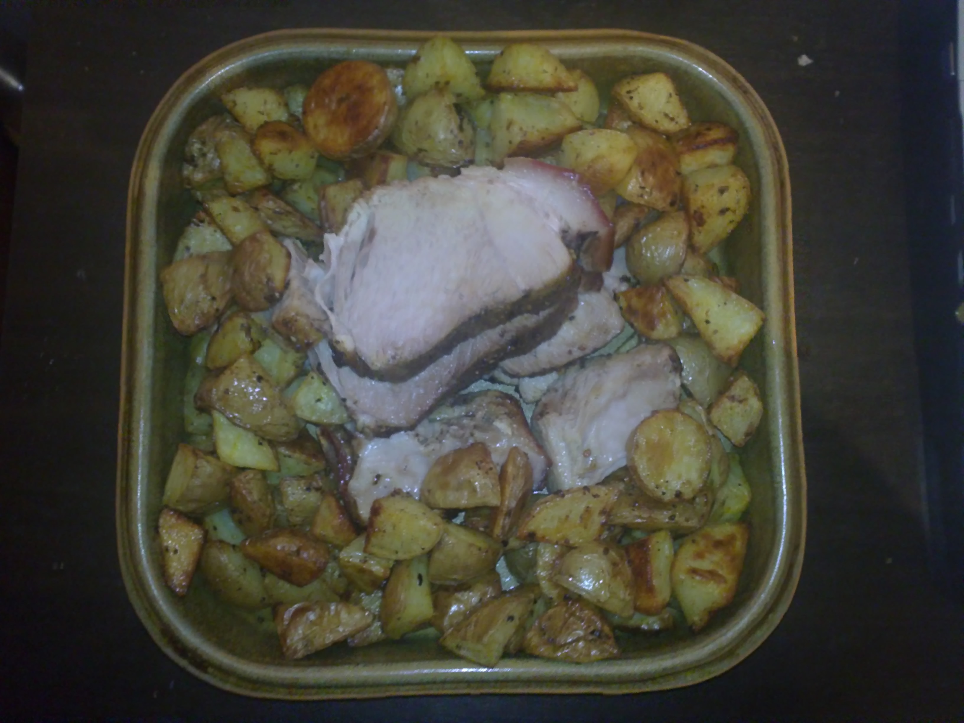 Approx 600g of roast pork and 1kg of roast spuds, seasoned with olive oil and Moroccon spice, and I combined some left overs to make my own dipping sauce with mayonaise, aioli, feta& spinach and a little bit of mixed herb.