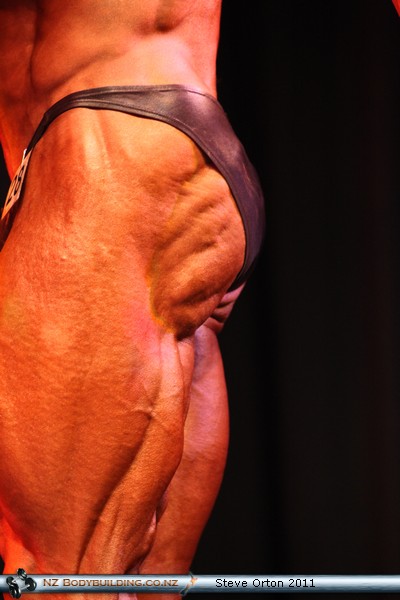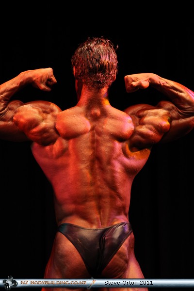 Rear double bicep pose shows good conditioning, his glutes though look over-developed for a guy his size, they're striated so it's not fat making it big is it?